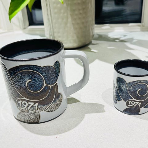 Stort årskrus fra Royal Copenhagen 1987. Designet af Mogens Andersen. Flotte grønne, hvide og sorte farver. Få almindelige brugsspor nede i bunden af kruset. Ingen skår eller afslag.