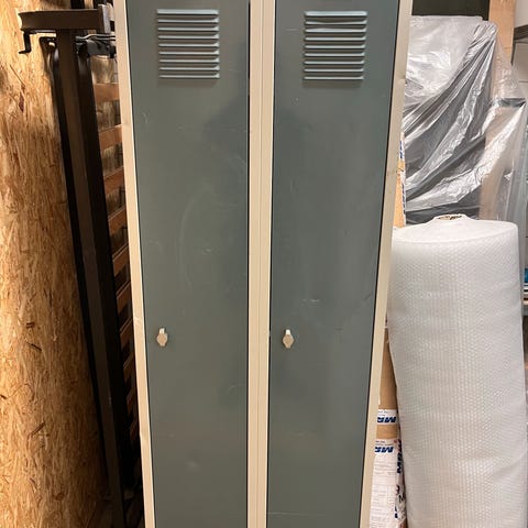 Flot og solidt gråt metalskab / lockerskab / garderobeskab med tre sammenhængende skabe. Hvert skab har en tophylde og i det store rum en bøjlestang øverst.