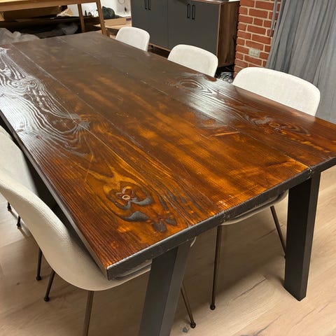 Velholdt og meget stabilt Davos spisebord i matlakeret natureg. Små revner/mærker i et par af bordbenene.