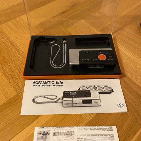 Agfa Agfamatic 2008 pocket kamera i sort og sølv. Kompakt analog kamera til 110 pocket-film med indbygget sensor-udløser og søger. Kamerahuset er udført i plast og metal og er designet til nem transport i lomme eller taske. Velegnet til brugere, der ønsker et lille analogt kamera til hverdags- eller rejsefotografering, forudsat at der anvendes kompatibel pocket-film og eventuelt tilbehør som blitzkube efter behov.