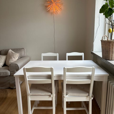 Solidt spisebord fra ikea. Navn: skogsta. Har været brugt af småbørnsfamilie, så der er mange brugsspor. Dog ikke noget en slibning ikke ville kunne klare.