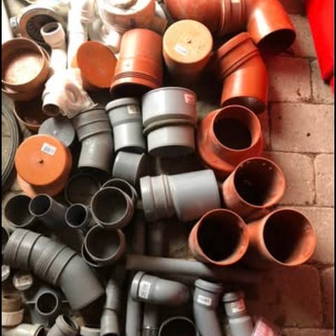 Tegra afløbsfittings i grå plast. Blandede rørdele og bøjninger med gummimuffer og spændebånd, egnet til afløbsinstallationer i plast. Flere typer vinkler og samlestykker i samme parti, som kan anvendes til samling og tilpasning af afløbsrør i VVS-installationer.