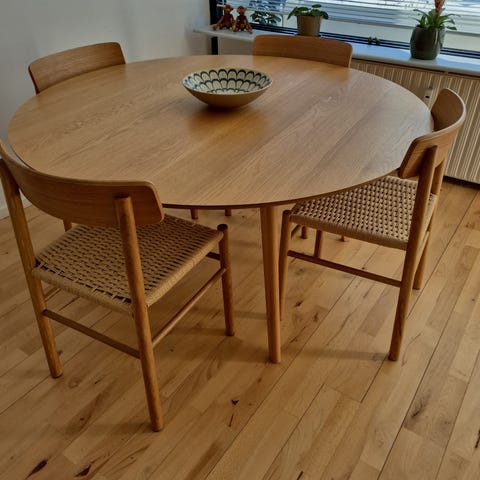Står som nyt, komfortable spisebordstole. Nypris 8600 kr. Med de 4 spisebordstole. Beholder 2 af dem. Kan afhentes efter d 20 maj 2026 i Greve. Ville rigtig gerne have haft det med det nye sted jeg flytter hen. Men der er desværre ikke plads, så skal leve med et mindre bord og mindre stole. Derfor jeg sælger.