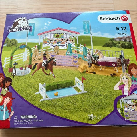 Schleich legesæt med hestegård og dyrelegeplads i plastik. Sættet omfatter blandt andet stor hestegård med stald, hus og tilbehør, dyrelegeplads med klipper og hegn samt hestetransporter med bil og hestestald fra Farm World- og Horse Club-serierne. Indeholder forskellige figurer, dyr, køretøjer og tilbehør til rolleleg med heste og andre dyr. Velegnet som samlesæt til børn, der kan lide detaljerede dyre- og gårdscenarier.