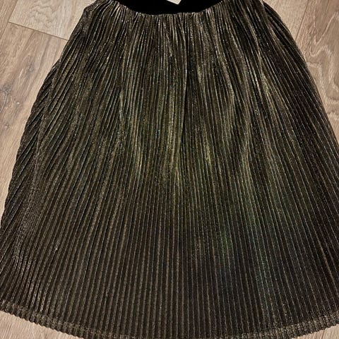 Herlig dekorativ nederdel til festlige anledninger. Guld med pailletbroderi og flæseskørt forneden. Der er sort foer i nederdelen. Lynlås bagtil. Den måler 38 cm (x2) i livet. Længden er 75 cm. Materiale polyester.