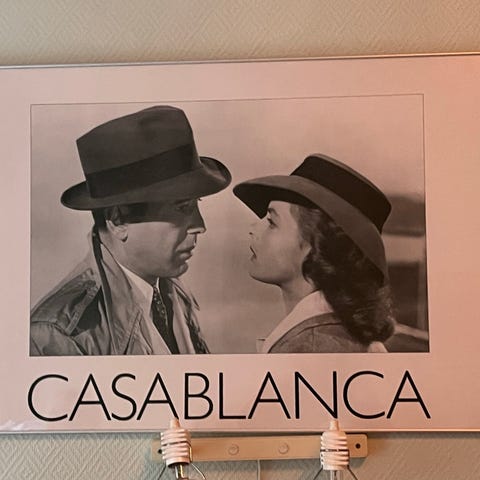 Casablanca filmplakat uden ramme. Plakaten viser motiver og skuespillere fra filmen Casablanca med titel og credits trykt øverst og nederst.