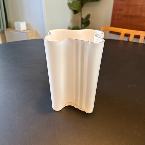 Iittala Alvar Aalto vase i hvidt glas. Organisk, bølget form egnet til blomster eller som dekorativt objekt.