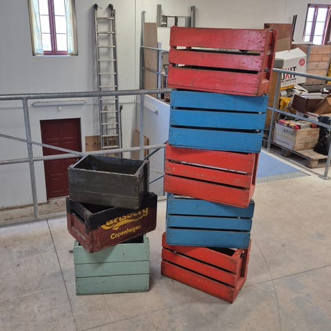 Carlsberg i mørkerød og Ceres i mørkegrøn. Har været brugt som kommoder/tv-bord i indretning, men bruges ikke længere.