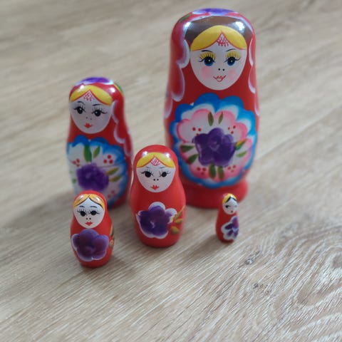 Babushka trædukker sæt med 3 figurer i håndmalet design. Dukkerne er fremstillet i træ og dekoreret med traditionelle blomster- og bladmotiver i røde og beige nuancer. Sættet består af tre dukker i forskellige størrelser, der kan placeres ved siden af og i hinanden. Undersiden af den største dukke er mærket "Made in USSR" med trykt nummer 4003. Velegnet som samlerobjekt eller dekoration.