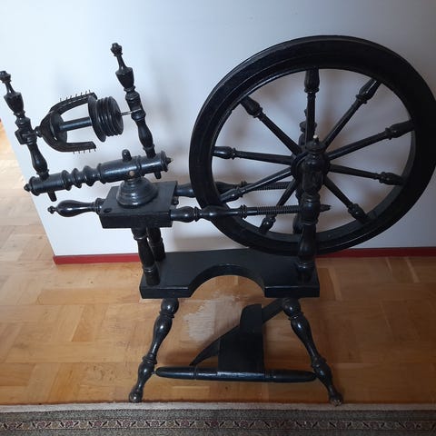 Rok i træ med drejet understel og stort hjul. Fodbetjent med træpedal og klassisk konstruktion til spinding af garn. Egner sig både som funktionelt redskab til håndarbejde og som dekorativt møbel i boligindretning. Mærke og model er ikke angivet.