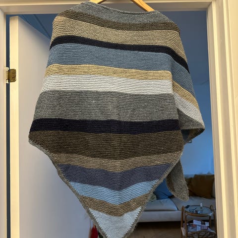 Hjemmestrikket trekantet uldsjal i friske multifarver