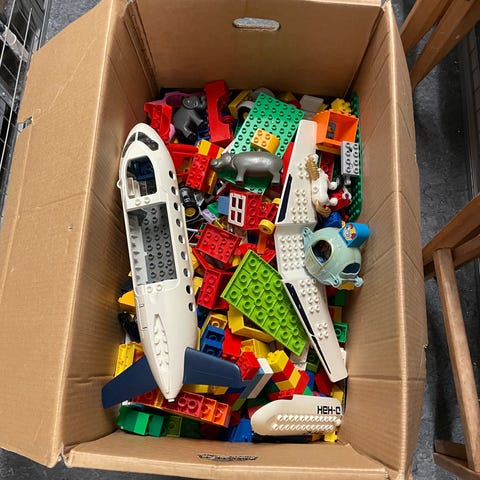 STOR flyttekasse blandet LEGO DUPLO klodser. Kassen indeholder et større udvalg af LEGO DUPLO klodser og dele i forskellige former og farver, herunder basis-klodser, plader, køretøjsdele, Disney figurer og tilbehør.
