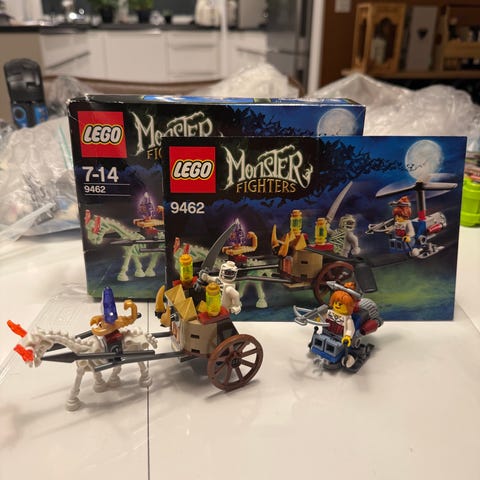 LEGO Monster Fighters sæt 9462. Sættet indeholder blandt andet en skelet-hest med vogn, en lille helikopter samt flere minifigurer. Velegnet til leg og samling i Monster Fighters serien.