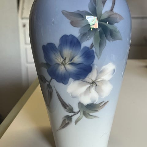 Royal Copenhagen porcelænsvase med Pragtsnerle Gml. nr.: 790A-4646 Motiv nr.: 790A Vase-form nr.: 4646 Teknik: Underglasur Bundfarve: Tonet blå