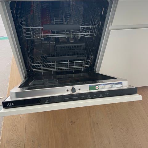 KitchenAid opvaskemaskine til integrering i køkken. Maskinen fremstår i rustfrit stål med indbygget front til køkkenløsning. Indvendigt er der flere kurve og justerbare hylder til bestik, tallerkener og glas. Egnet til standard køkkenmoduler og til daglig opvask i husstande, hvor maskinen ønskes integreret diskret i køkkenindretningen. taget ned i Hotellejlighed. Stort set aldrig brugt.