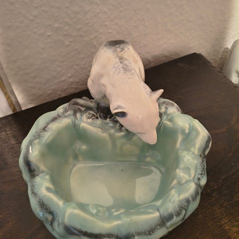 Fint retro askebæger med isbjørn, 14 cm langt. Antagelig fremstillet i Tyskland. Sender gerne men ikke via “fiks færdig”. Køber betaler porto.