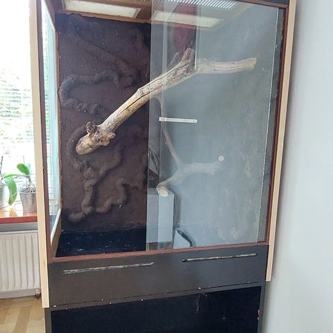 Terrarie med baggrundsplade, af xaxim på to sider, så man kan se ind fra front og højere side.