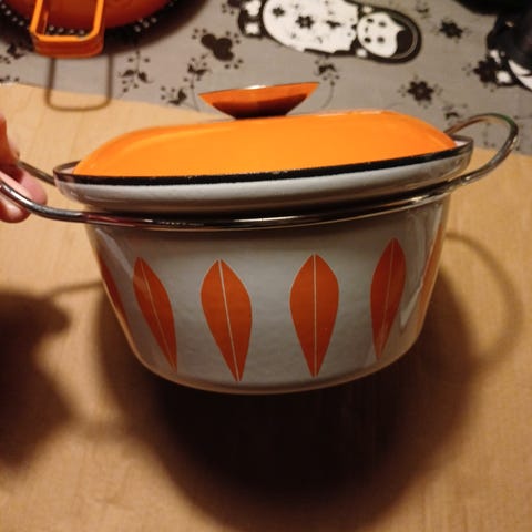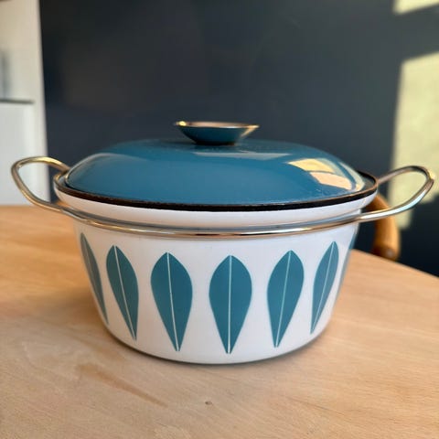 Lotus gryde 27 cm. med låg i emalje. Formoder det er “Cathrine Holm - made in Norway”. Gryden har hvid yderside med grønt bladmotiv og grøn emaljeret låg med metalgreb. Indersiden er hvid emalje, og gryden har to metal håndtag. Velegnet som gryde til madlavning eller servering i køkkenet.