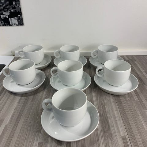 Stel i hvidt porcelæn med lysegrøn kant og gylden dekoration. Minder meget om lidt marokkansk mønster.