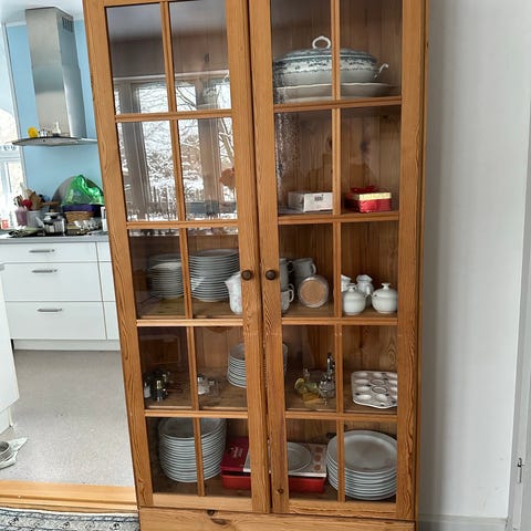 Fint vitrineskab med diverse brugsspor - se billeder. Har 5 hylder som kan flyttes på, men desværre mangler der to små holdere.