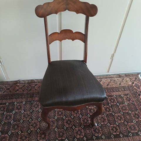 Træstol spisebordsstol med polstret sæde og stribet stofbetræk. Stolen har udskåret ryg i mørkt træ og drejede forben. Egnet som spisebordsstol eller ekstra stol i stue eller køkken. Sædet er løst monteret på trærammen, som vist på billedet fra undersiden.