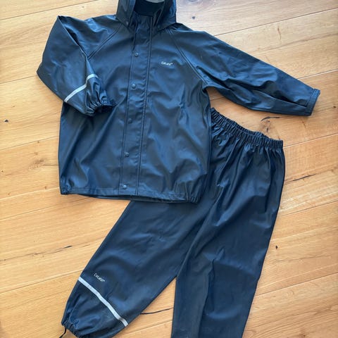 Fint navy blåt regnsæt fra CeLaVi. Str. 120. Flot stand. Evt. pletter/ smuds' er ikke forsøgt fjernet.