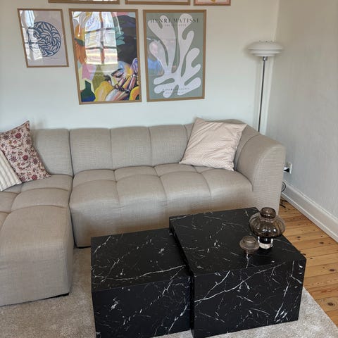 Jysk sofabord i lyst træ med åben hylde under bordpladen. Bordet har et enkelt, rektangulært design med lige kanter og glat overflade. Den åbne hylde giver ekstra opbevaringsplads til fx bøger eller magasiner. Designet er af Marianne Tuxen og passer ind i mange typer stuer eller værelser, hvor der er behov for et lavt bord med ekstra opbevaringsmulighed.