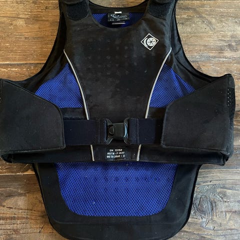 Charles Owen Ultralite ridevest til barn i størrelse XL. Ridevesten er udført i sort og blå mesh-materiale med justerbare velcrostropper i siderne og ved skuldrene. Modellen er en kropsbeskytter med forlænget rygstykke for ekstra dækning. Velegnet som sikkerhedsudstyr ved ridning for børn i den angivne størrelse. Den er brugt og gammel men den er i en fin stand. Jeg tager i mod bud.