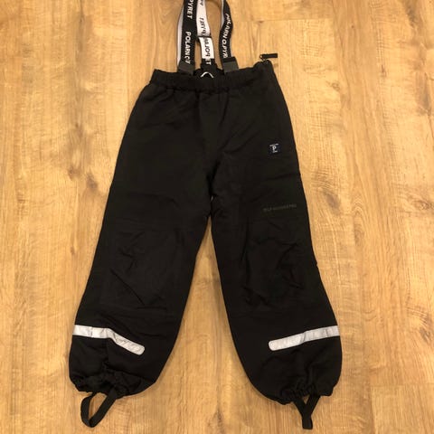 Bukserne er sorte og fremstillet i polyester. Den har justerbare seler og lynlås foran. Velegnet som overtøj til køligere vejr og udendørs leg.