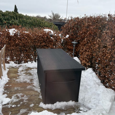 Hyndeboks i grå kunstflet velegnet til udendørs brug på terrasse, altan eller i have. Hyndeboksen giver opbevaringsplads til hynder eller andet tilbehør. Kunstflet-materialet er beregnet til at kunne stå ude i forskellige vejrforhold.