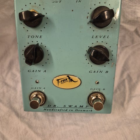 En dejlig gul distortion fra danske T.Rex. Takket været Tone kan du selv bestemme hvor meget diskant du vil have. Og takket være Level kan du justere den overordnede volume. Boost giver ekstra fuzz, og du kan let få noget Hendrix eller Marc Bolan ud af pedalen. Den er sikkert også fin til heavy metal. Bruger 9v strømforsyning eller batteri. Nogle år gammel, men jeg har ikke slidt den ned.