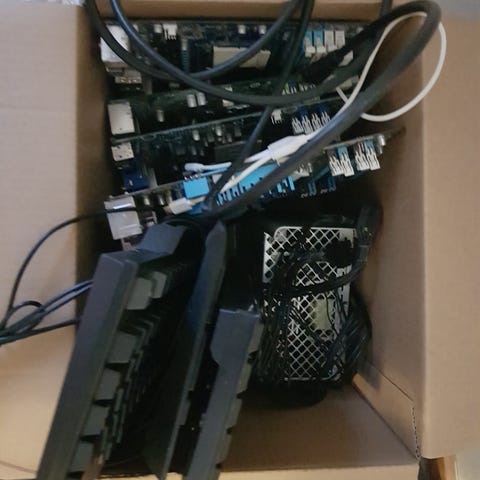 Diverse bundkort, computerkabler, Chromebooks, processorer