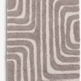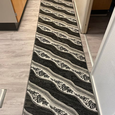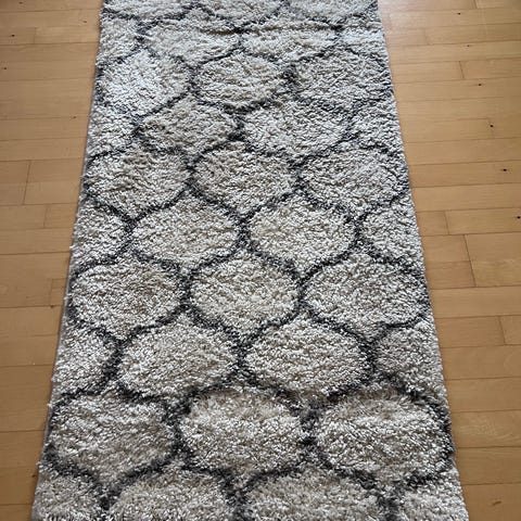 IKEA løber. Tæppet har rød bundfarve med geometriske mønstre i blandt andet hvid, blå og beige samt en markeret bort langs kanterne. Det er udstyret med korte frynser i enderne.