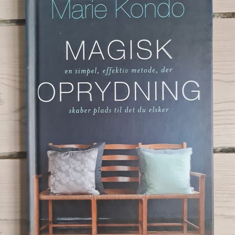 Marie Kondo Magisk oprydning bog. Dansk udgave af oprydningsbogen, der gennemgår en trinvis metode til at sortere, organisere og rydde op i hjemmet. Indeholder tekst og eksempler på, hvordan man kan gennemgå sine ejendele rum for rum og skabe bedre orden i boligen.