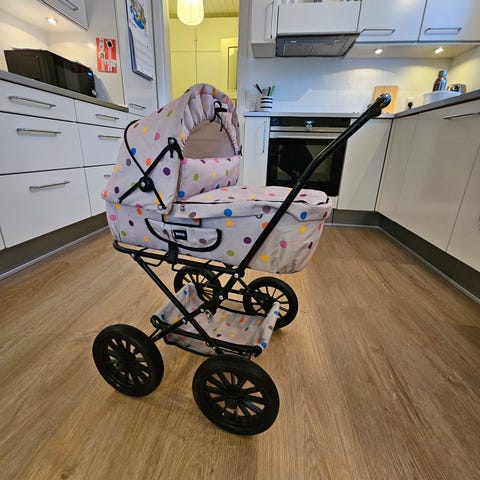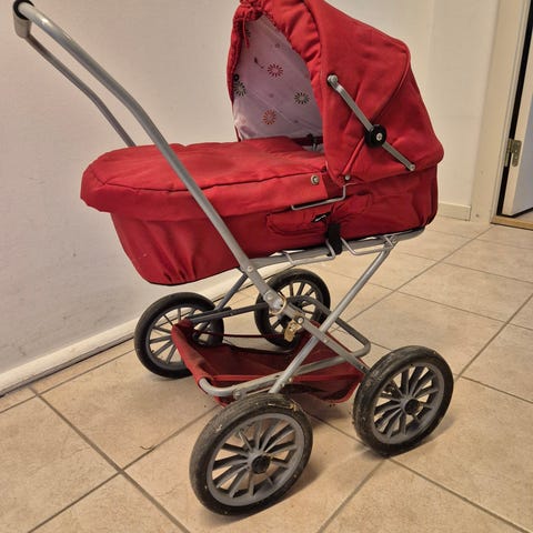 BRIO dukkevogn i rosa med flerfarvet mønstret kaleche. Vognen har hvidt stel, fire hjul og justerbart håndtag med brunt greb. Indvendigt er der polstret liggeflade og sele til dukken. Egnet til leg med dukker og bamser indendørs eller udendørs. På stoffet kan der forekomme synlige brugsspor, som ses på billederne.