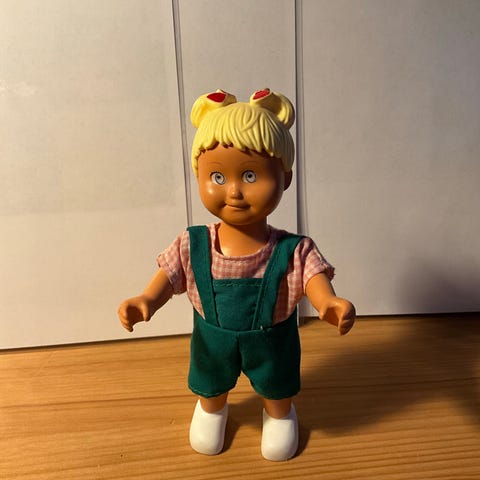 LEGO dukke i plast med kort brunt hår og fastmonteret grøn kjole med lyserød bluse og røde sko. Dukken er egnet som legetøj for børn eller som samlerfigur til LEGO relaterede samlinger.