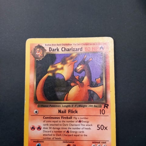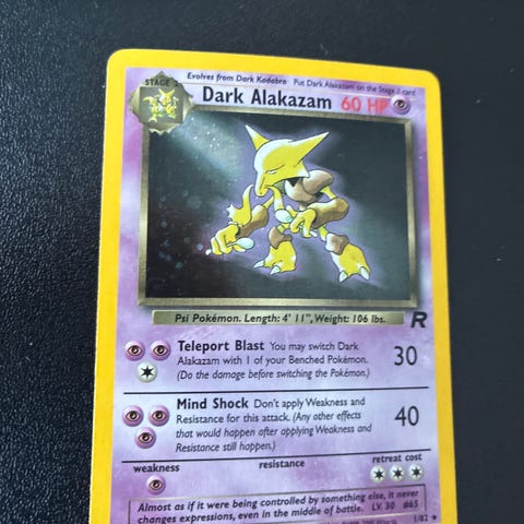 Pokémon Dark Alakazam samlekort fra Team Rocket-udvidelsen. Kortet viser Dark Alakazam, et Psychic-type Pokémon-kort med 60 HP. Angrebene på kortet er Teleport Blast og Mind Shock med tilhørende skadeværdier og energikrav. Bagsiden er standard blå Pokémon-kortbagside med Poké Ball-motiv. Egnet til samling eller spil i Pokémon Trading Card Game.