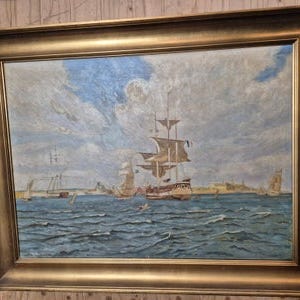 Klassisk dansk marinemaleri. Autentisk 1900-tals havnemotiv. Tydelig penselstruktur og håndværksmæssig kvalitet. Velegnet til både moderne og klassisk bolig