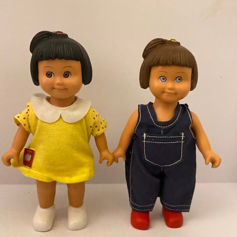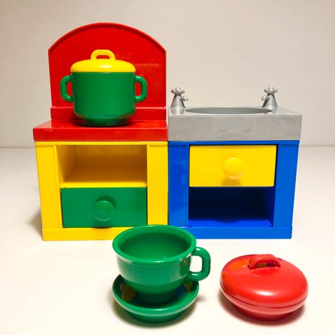 LEGO dukke i plast med lyst hår sat op i to totter. Dukken er iført grønne seleshorts, lyserød ternet bluse og hvide sko. Egnet som tilbehør til LEGO lege- og samlesæt eller som figur i rolleleg.