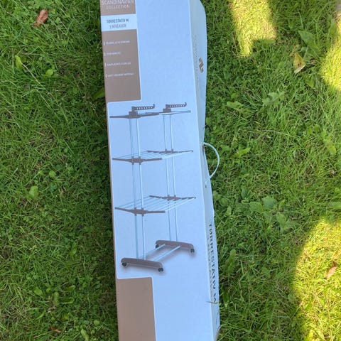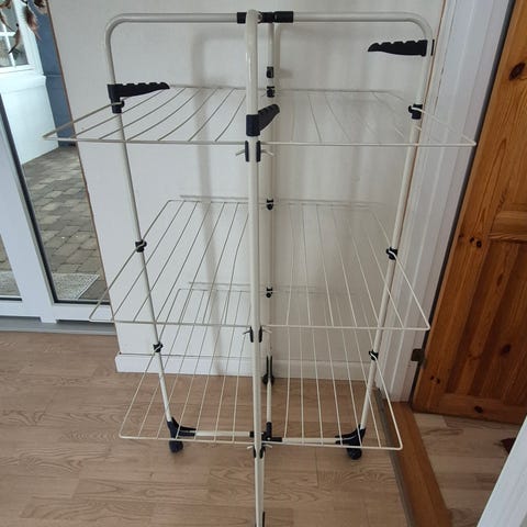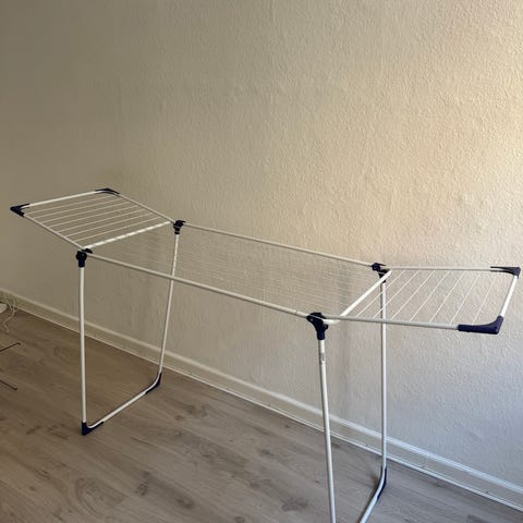 Tørrestativ med 16 meter tørreplads, der kan rumme 1-2 vaske. Hvid stålramme med blå udfoldelige vinger, der kan holde det lange vasketøj. Dets robuste parallelle ben sikrer stabilitet, mens den smalle bredde gør den nem at få gennem døråbninger. Sammenklappeligt for nem opbevaring.
