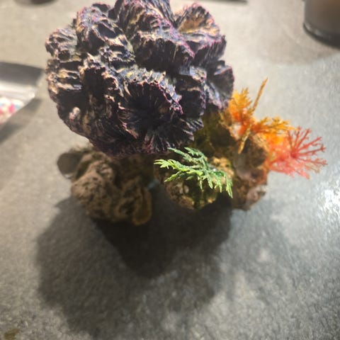 Dekoration til akvarium. En stor kunstige koral og to reje huler, og en mindre koral på sten med muslingeskal. Delene er udført i kunstmateriale.