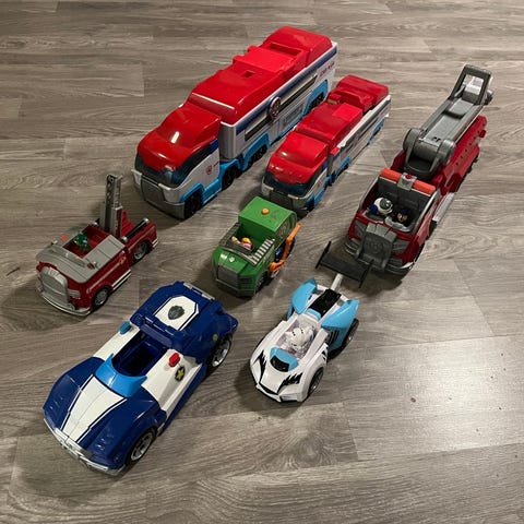 Paw Patrol legetøjsbiler og figurer sæt. Sættet består af flere køretøjer og tilhørende hundefigurer fra Paw Patrol-universet. Der medfølger blandt andet en grøn skraldebil, blå køretøjer og en lille figur med gul hjelm. Legetøjet er i plast og egner sig til leg på gulv eller bord, hvor børn kan genskabe scener fra serien eller finde på egne historier.