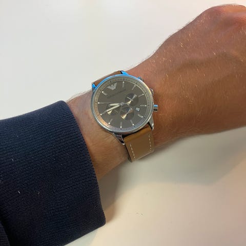 Armani herreur med sort læderrem. Uret har rundt urhus og analog urskive med markeringer. Remmen er justerbar med spænde. Velegnet som klassisk armbåndsur til mænd til daglig brug eller mere formelle anledninger.