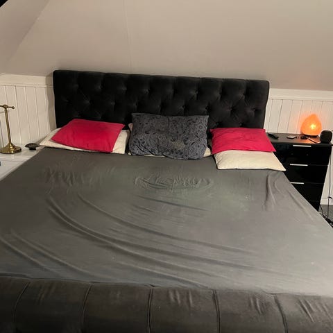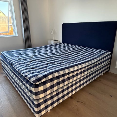 Hästens sengegavl i blå polstring. Gavlen har en enkel, polstret front med knapper og en afrundet topkant. Den er beregnet til montering bag sengen og kan bruges som ryglæn ved siddestilling i sengen. Egnet til soveværelse, gæsteværelse eller lignende indretning, hvor der ønskes en polstret afslutning bag sengen. Dette er et fejlkøb hvorfor den sælges ved budgivning nyt pris 29650 kr