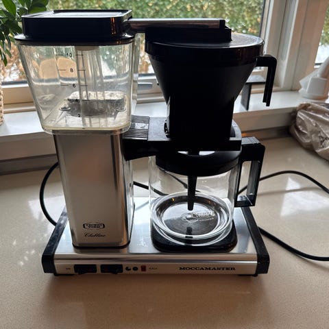 Moccamaster kaffemaskine med glaskande og aftagelig vandbeholder. Maskinen har drypstop-filtertragt i sort plast og gennemsigtig glaskande med sort håndtag. På fronten findes tænd/sluk-knap. Sendes gerne hvis modtager betaler fragt.