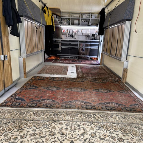 Fint gulv, og nye hylder i hele vognen, indvendig er den beklædt med vaskbart stål, håndvask, køleskab medfølger