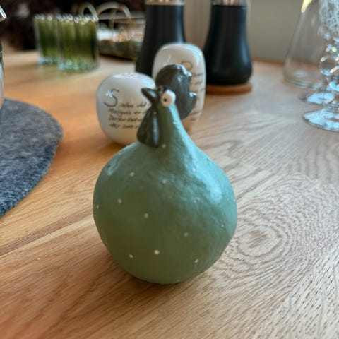 Små hønefigurer . Figurerne forestiller hvide høns med røde kamme og står på grønne sokler.