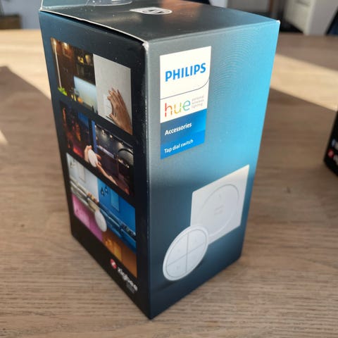 Philips Hue fjernbetjening i hvid. Enheden har tænd/sluk-knap, lysstyrkeknap og Hue-knap på fronten. Bagsiden har aftageligt batteridæksel. Fjernbetjeningen kan bruges til styring af kompatible Philips Hue-lyskilder f.eks. til at tænde og slukke lys samt justere lysstyrke.