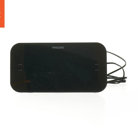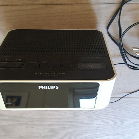 Philips HF3505 vækkeur med lys i hvid. Vækkeuret har indbygget LED-lys, der gradvist kan øges for at simulere solopgang. Foran er der digitalt display med rød tidsvisning og betjeningsknapper til indstilling af tid og alarm. På bagsiden sidder højttaler og strømtilslutning. Velegnet som natbordslampe og vækkeur i soveværelse eller børneværelse.