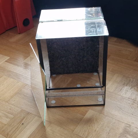 Glasterrarium med tre separate rum. Terrariet er udført i klart glas med lodrette sorte lister på fronten. Hvert rum er adskilt af glasvægge, Egnet til hold eller opbevaring af mindre dyr, insekter eller planter, hvor der er behov for opdeling i sektioner.